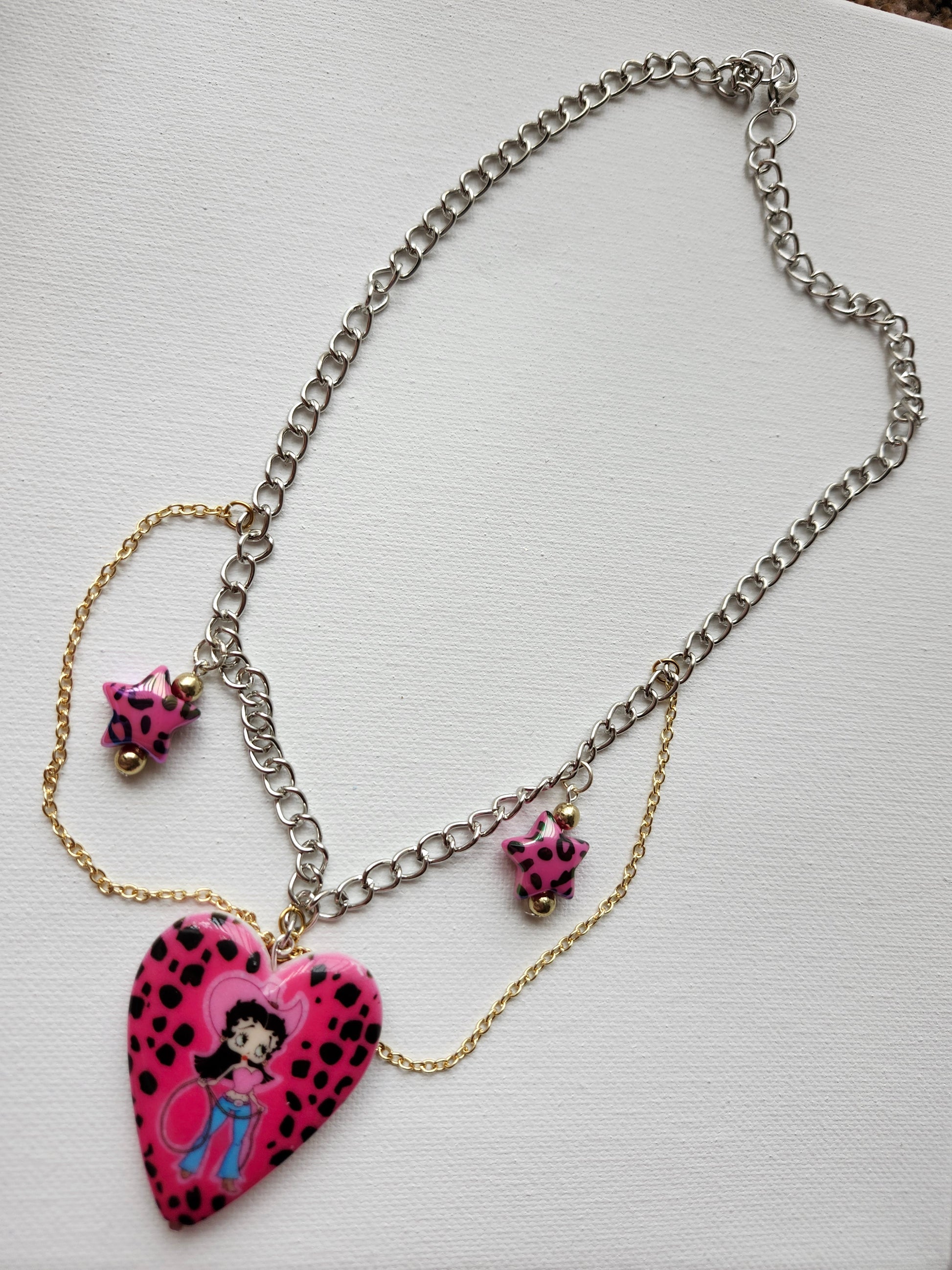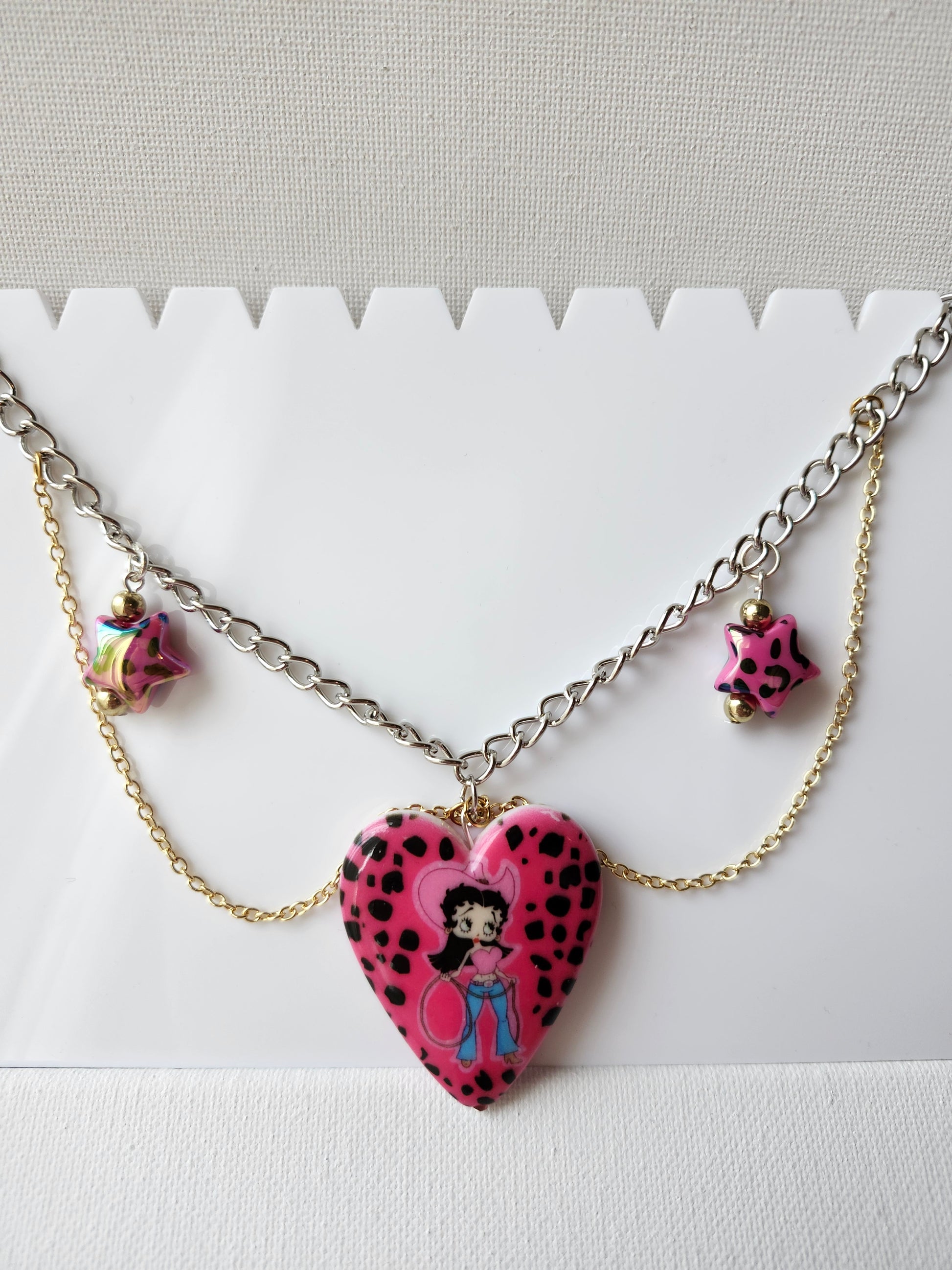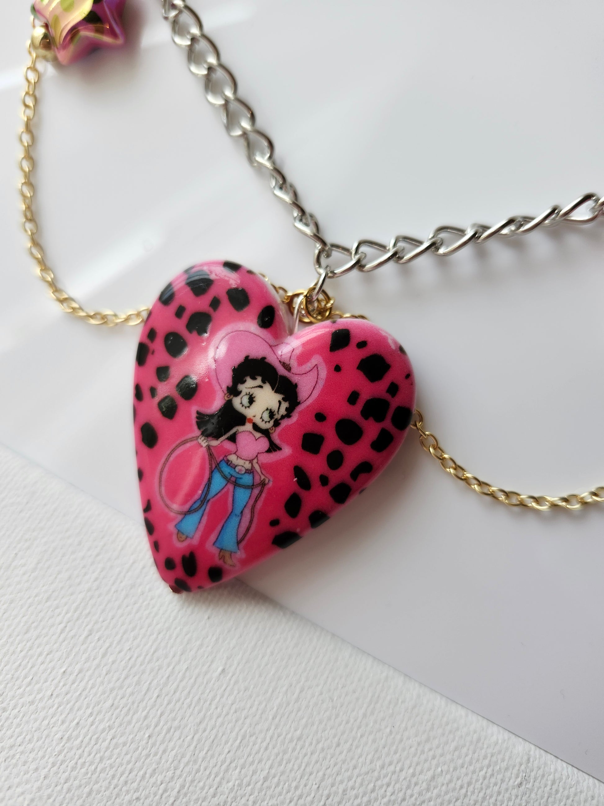 "Yeehaw! Add some fierce cowgirl vibes to your look with this Betty Boop Cowgirl Y2K Necklace. Handmade and chunky, it's a unique and playful addition to any outfit. Channel your inner Betty and make a statement!"